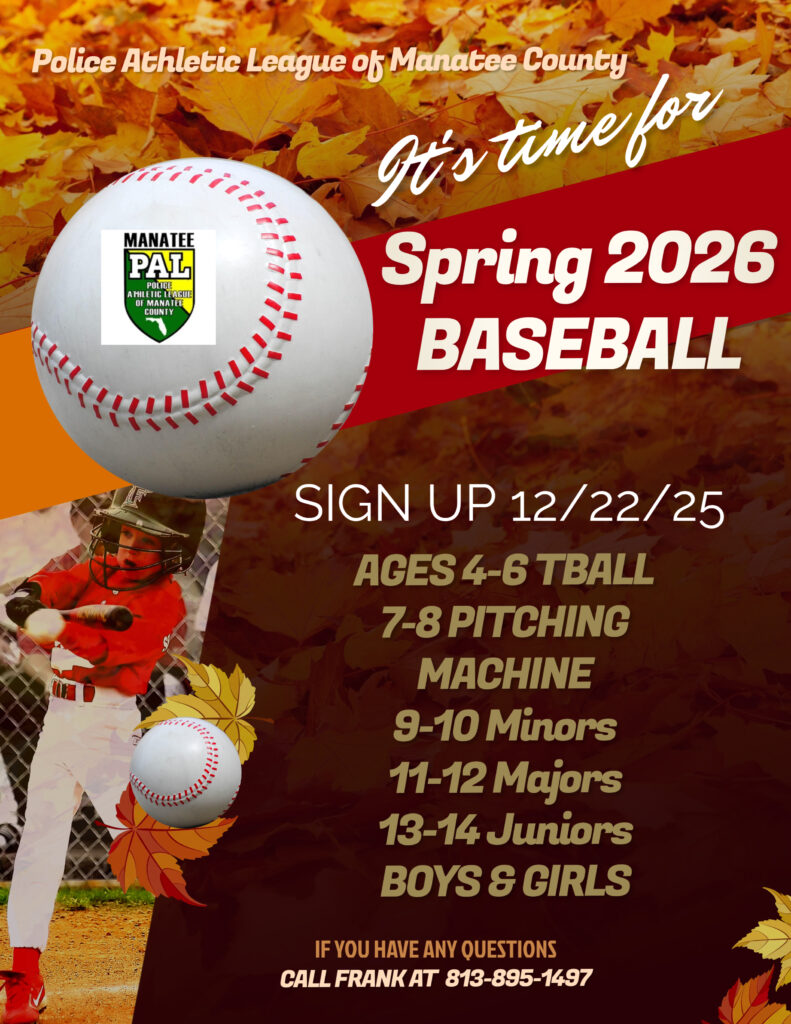 2026 Spring Baseball registration starts 12/22/25. $75 per player. Practice starts January 19th. Please reach out to Frank at 813.895.1497 with any questions or register online at www.manateepal.org.